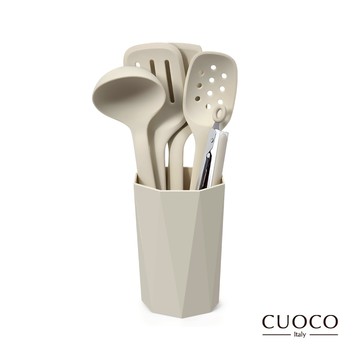 【CUOCO】北歐半月柄全矽膠廚具6件組-白色(炒鏟+煎鏟+湯勺+漏勺+料理夾+廚具筒)