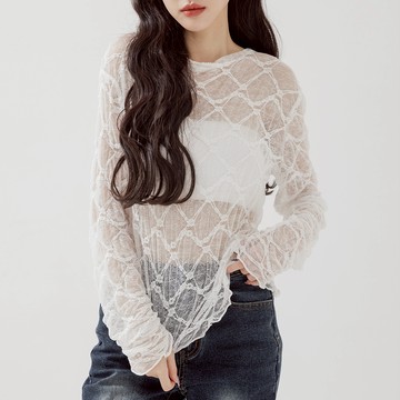 QUEENSHOP_F 女裝 長袖 菱格紋蕾絲造型透膚上衣 兩色售 現+預 【01099101】