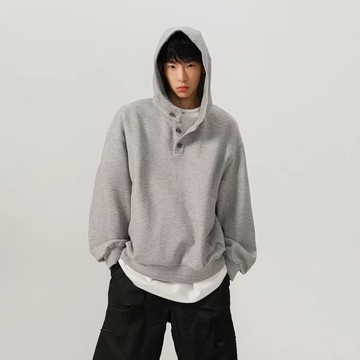2025春秋慵懶風鈕扣連帽大學T男 高級感簡約潮牌百搭休閒上衣男