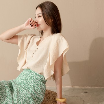 OB嚴選 小V領荷葉袖造型釦上衣 《AB18326》