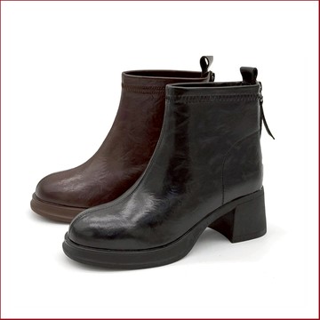 真皮 短靴 厚底靴 柔霧界線百搭真皮微光柔皺厚底方跟短靴ROBINLO (MICHELL 鏡月黑/暖影棕)