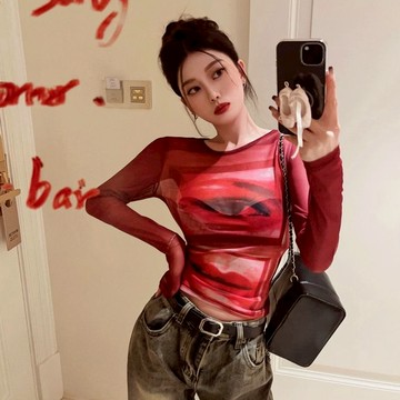 點我下載長袖t恤 ✨美式紅色扎染透膚防曬衣短版上衣辣妹夏天穿搭緊身顯瘦上衣大碼女裝 10817