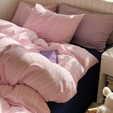 【台灣發貨】全棉純棉床上四件套宿捨三件套簡約a類母嬰級水洗棉四件套被套柔軟親膚裸睡格子四件套 標準加大雙人 被套 枕頭套