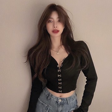 毛衣 INS美式黑色低胸深V領內搭針織毛衣短版上衣女生緊身顯瘦露肚微辣上衣 30914
