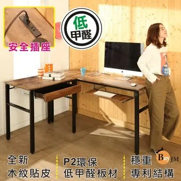 點我下載BuyJM低甲醛復古風L型160+80公分抽屜鍵盤附插座工作桌