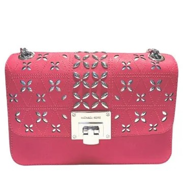 Michael Kors 桃紅色防刮皮革鉚釘小花裝飾鍊條斜背包-附提袋
