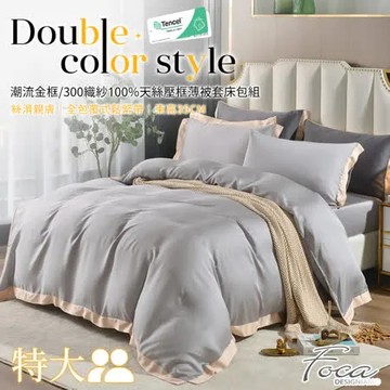 點我下載【FOCA時尚灰】特大-潮流金框 頂級300織紗100%純天絲素色壓框四件式薄被套床包組
