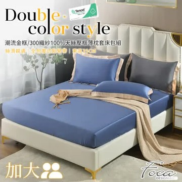 點我下載【FOCA典藏靛】加大-潮流金框 頂級300織紗100%純天絲壓框薄枕套床包三件組