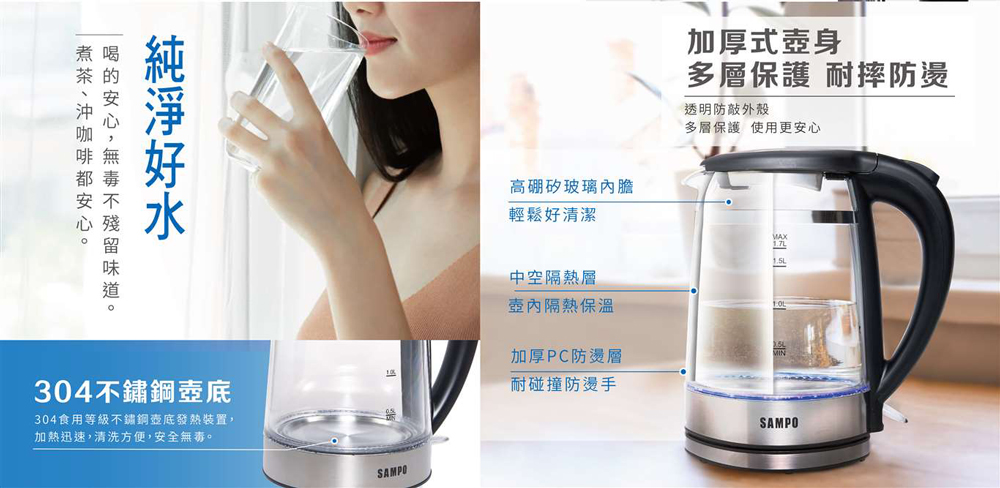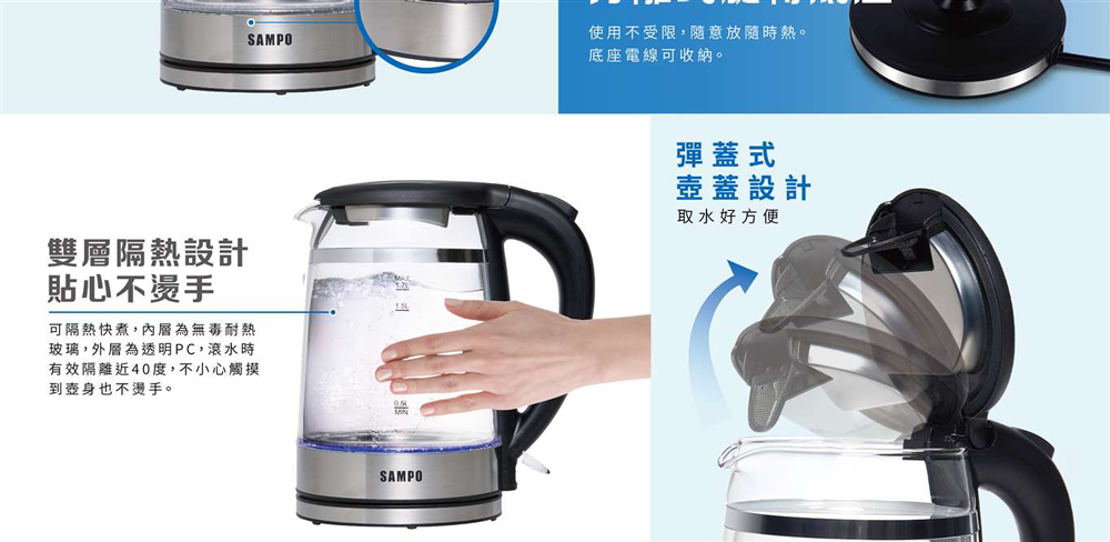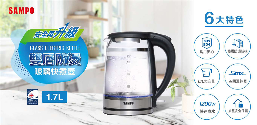【SAMPO聲寶】1.7L雙層防燙玻璃快煮壺 KP-CH17D