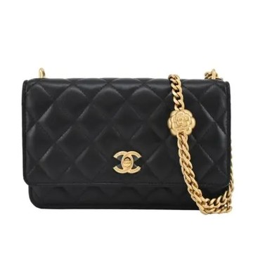 CHANEL經典雙C LOGO菱格紋小羊皮山茶花調節釦WOC斜背包(黑色)