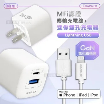 點我下載台灣三洋 MFi原廠認證線 Lightning USB 傳輸充電線(200cm)+WELLY 氮化鎵GaN 迷你充電器