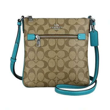 點我下載COACH ROWAN銀字馬車LOGO老花PVC拉鍊斜背扁包(迷你/卡其x淺孔雀藍)