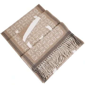LOEWE 經典緹花LOGO撞色羊毛流蘇保暖長圍巾.浅褐色