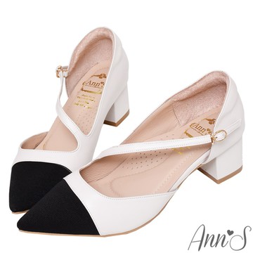 Ann’S高訂綿羊皮-小香風撞色 絕美弧線粗跟尖頭鞋5cm-白