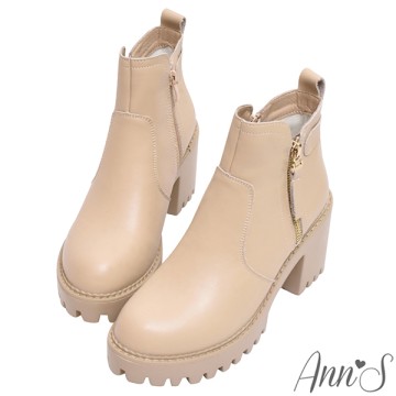 Ann’S波琳-真皮小羊皮切爾西圓釦帶粗跟短靴5cm-卡其(版型偏小)