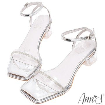 Ann’S夏日玻璃鞋-透明碎鑽一字綁帶粗跟方頭涼鞋-7.5cm-白(季末換季出清)