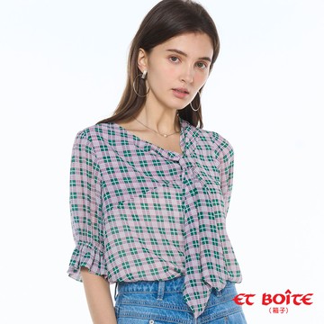 配色格紋圖案雙蝴蝶結蓬袖襯衫(FF33L0A0480) - ehka sopo