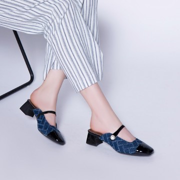 優雅小姐 典雅雙色拼接方頭穆勒跟鞋 牛仔藍 (4B2957)