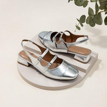 優雅小姐 摩登雙帶後空瑪莉珍方頭跟鞋 銀箔 (4J2901)