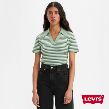 女款 深V領短袖針織衫 松木綠條紋 熱賣單品