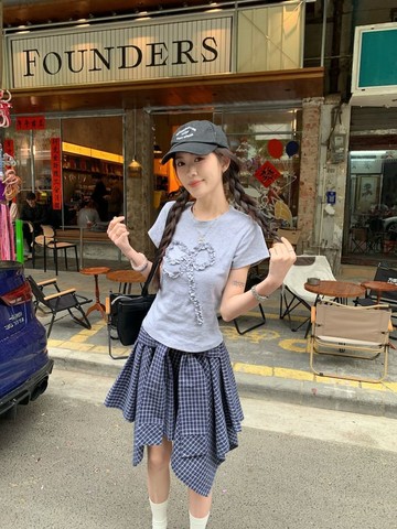 【missy shop】愉悅蝴蝶結T恤格紋不規則短裙套裝-79291