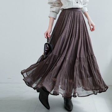 女士夏季杏色薄款紗裙網紗半裙A字中長蓬蓬百褶裙女夏
