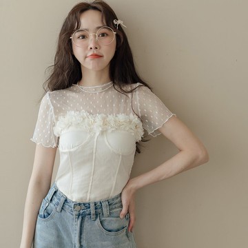 加購優惠(L) 透膚蕾絲白色短袖上衣