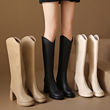 【現貨出清】【35-43全尺碼】馬靴.氣質素面皮革V型後拉鍊防水台粗跟長靴.白鳥麗子