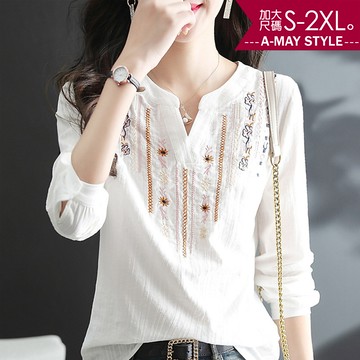加大碼 襯衫 小V領刺繡民族風顯瘦上衣(S-2XL)【XHI03035】*艾美時尚(現+預)