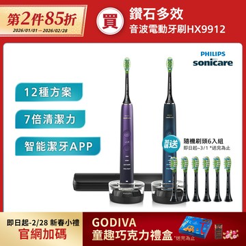 【1/1-2/28第二件85折】飛利浦DiamondClean亮白隨行智能鑽石音波電動牙刷(藍鑽+紫鑽)(HX9911/62)+(HX9911/69)