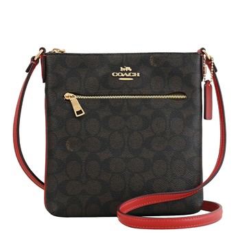 COACH 經典印花拼接拉鍊斜背扁包(卡其/白邊)