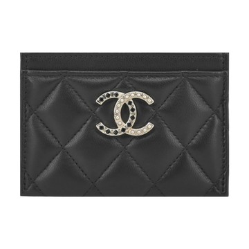 CHANEL 寶石珍珠雙C LOGO菱格紋小羊皮卡片夾(黑色)