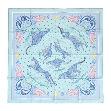 Hermes 愛馬仕 Guepards Bandana 90 手工捲邊斜紋真絲雙面方巾(冰藍/綠)