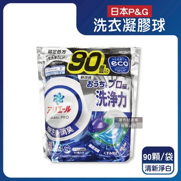 日本P&G-Ariel PRO級酵素強洗淨力去污消臭洗衣凝膠球90顆/袋-清新淨白(藍)(家庭號補充包,去黃亮白洗衣球,筒槽防霉洗衣膠囊,全機型適用)
