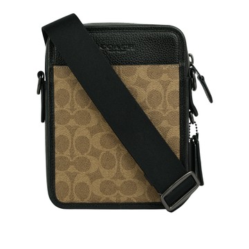 COACH Sprint Map 25 緹花布拼皮革翻蓋斜背包/卡其/黑色