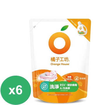 【Orange house 橘子工坊】天然無香精制菌洗淨病毒洗衣精補充包1500mlx6包