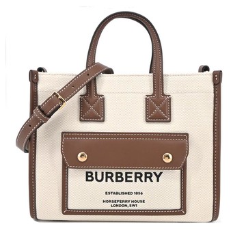 BURBERRY 巴寶莉 Frey 字母帆布拼皮革兩用托特包(米白x木棕色)mini