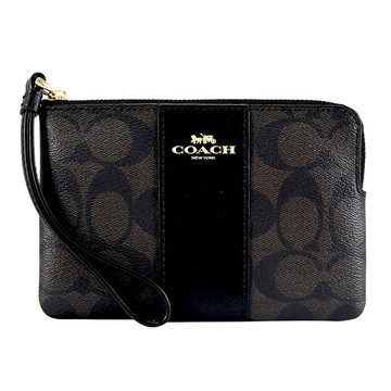 COACH 58035 馬車LOGO條紋皮革零錢手拿包.深咖/黑