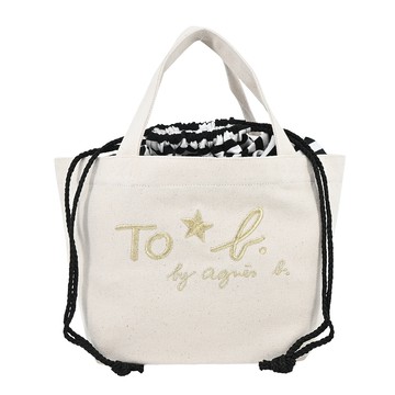 agnes b. TO B.刺繡帆布束口手提包-米_廠商直送