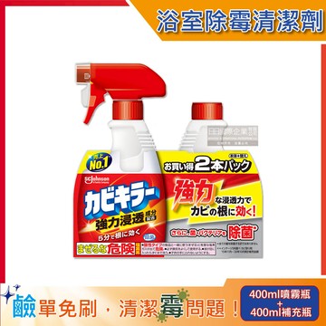 【日本SC JOHNSON莊臣】(1+1超值組)浴室多用途免刷洗5分鐘瞬效強力浸透消除霉根鹼性泡沫清潔劑(400ml噴霧瓶+400ml補充瓶)/組_廠商直送