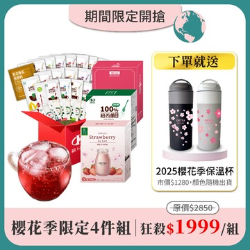 【櫻花季限定-綜合禮包4件組】27件試茶福箱x1箱+櫻花草莓歐蕾x1盒+抹茶拿鐵無加糖款x1盒+玫瑰纖果茶x1盒 免費送:櫻花季限定保溫杯600mlx1(市價$1280.兩款隨機出貨)|全台限量100組