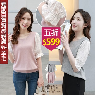 ★五折價$550★糖罐子【E65139】拼接蕾絲圓領針織上衣→現貨