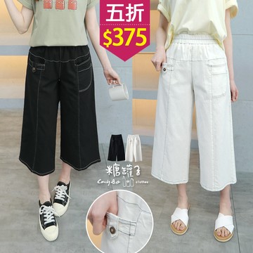 ★五折價$375★糖罐子【KK8078】縮腰配色車線單釦造型口袋素面寬褲→現貨
