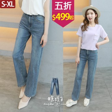★五折價$499起★糖罐子【KK8469】後縮腰單釦車線口袋刷色牛仔寬褲→現貨(S-XL)