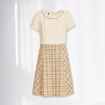 ILEY伊蕾 金蔥格紋小香花呢短袖洋裝(杏色;M-XL)1223217005