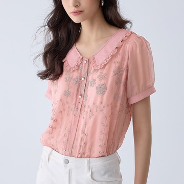 ILEY伊蕾 縷空刺繡荷葉領雪紡上衣(粉色;M-XL)1242181808