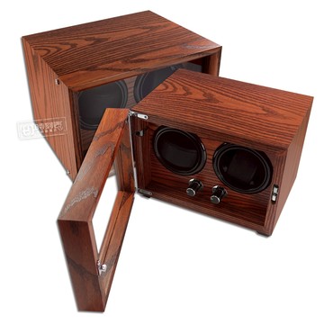 機械錶自動上鍊盒 2旋2入錶座轉動 LED燈 紅檀木皮 - 紅褐x黑 #SKW142P02-EB