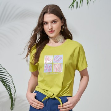 CLL巧玲瓏 色塊英文字V型綁帶上衣(黃綠色) 7333913