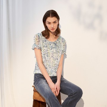 雲朵自訂款-小V臉.方領百褶拋袖碎花雪紡上衣