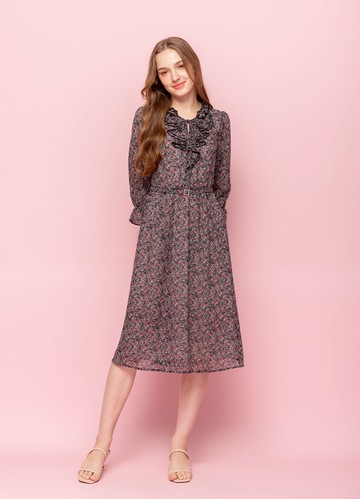 (M) 質感碎花紡紗短袖滿版印花粉色洋裝